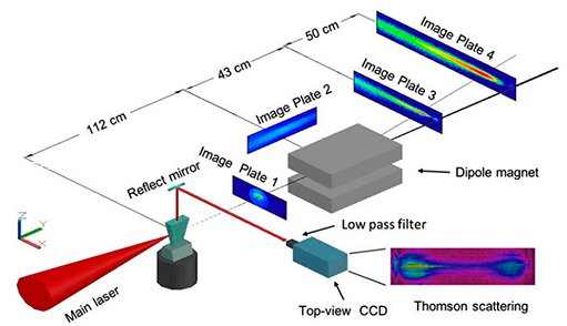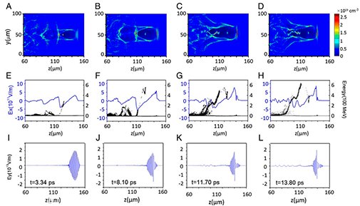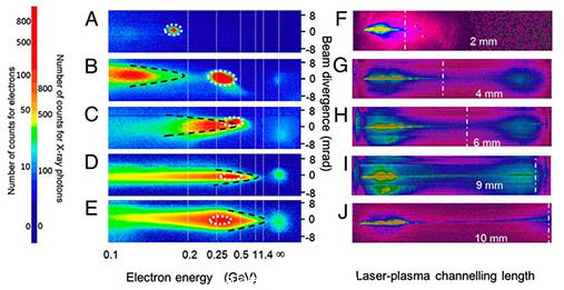 圖2.隨著等離子體(ti) 通道的增長產(chan) 生了兩(liang) 群電子。第一群為(wei) 單能電子束,而輻射的出現和增強與(yu) 第二群電子的加速緊密關(guan) 聯