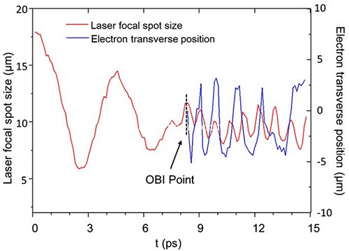 圖4.模擬顯示激光束斑的周期性震蕩引起空泡的波蕩進而與(yu) 第二群電子形成共振