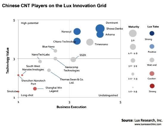 多家專(zhuan) 注於(yu) 碳納米管研究與(yu) 製造的中國廠商已經在專(zhuan) 利與(yu) 發表論文方麵取得全球領先的地位了。(來源:Lux Research)