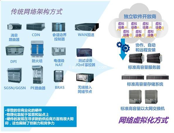 這是另外一個(ge) 對不同的人含義(yi) 不同的術語,具體(ti) 取決(jue) 於(yu) 行業(ye) 。就我們(men) 的情況來說,我們(men) 注重的是它對電信行業(ye) 意味著什麽(me) 。要理解是什麽(me) 推動了NVF的發展,我們(men) 可以先看一下電信行業(ye) 傳(chuan) 統上是如何部署自己的網絡的。30多年來,電信公司一直依靠定製的係統,其中一些企業(ye) 開發了自己的ASIC(通過Cisco、F5或Juniper),以及專(zhuan) 用操作係統(如Cisco ioses),然後把這種技術用在基站、路由器和以太網交換機上,所有這些產(chan) 品都是專(zhuan) 門為(wei) 他們(men) 的應用優(you) 化的。當然,專(zhuan) 用就意味著價(jia) 格昂貴,開發緩慢。