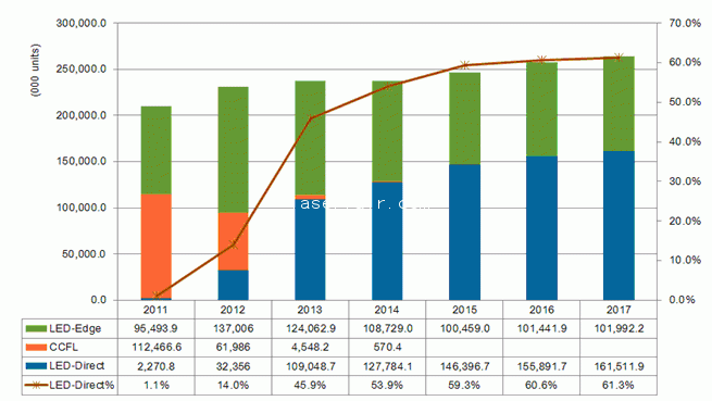 NPD DisplaySearch上海辦公室,2014年5月6日---2014 LED產(chan) 業(ye) 基本上會(hui) 是一個(ge) 好年,主要原因在於(yu) ,LED雖然在背光市場需求持平,但是照明市場需求持續升溫。加上對於(yu) 新增MOCVD設備的審慎評估,導致自2014年後供給需求逐漸達到穩定的狀態。不過因為(wei) 照明市場的規格混亂(luan) 及進入門坎較低,整個(ge) 照明市場的需求變成少量多樣的形態,對於(yu) 大規模的企業(ye) 較為(wei) 不利,所以大公司在照明上都是采取單一規格且固定毛利率的經營模式。而LED在背光的應用中各位可以發現,LED在筆記本電腦(Notebook)背光應用上已經達到100%,而監視器(Monitor)也幾乎達到100%,尤其是電視從(cong) 2011年開始將背光源改為(wei) LED後,短短3年間LED TV的滲透率已經到了99%,更發展出所謂的直下式背光,將背光設計發揮到淋漓盡致,帶動了新的供應鏈,例如:BMS(Backlight Module System)、直下式LED光源、二次光學透鏡及直下式背光燈條打件。而一些原有的背光模塊廠商因為(wei) 沒有跟上這波背光設計的變化而被淘汰。我們(men) 可以說當平麵顯示器背光的設計進入成熟期的時候,各家公司比拚的不隻是單純的技術及服務,更要比的是公司的規模大小及整個(ge) 集團的供應鏈是否可以配合。也因為(wei) 比拚的項目越來越多,導致平麵顯示器背光產(chan) 業(ye) 持續洗牌中,大者恒大態勢日趨明顯,而整體(ti) 市場沒有太大變化,但是規模經濟及技術能力築起了一座高牆,讓後進者無法跨入,這反而不會(hui) 像照明應用有負毛利的情況發生。而隨著整機廠或是係統廠電視降價(jia) 的壓力越來越大,其整合的力度也會(hui) 越來越大,這將不斷壓縮小廠的生存空間。
