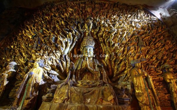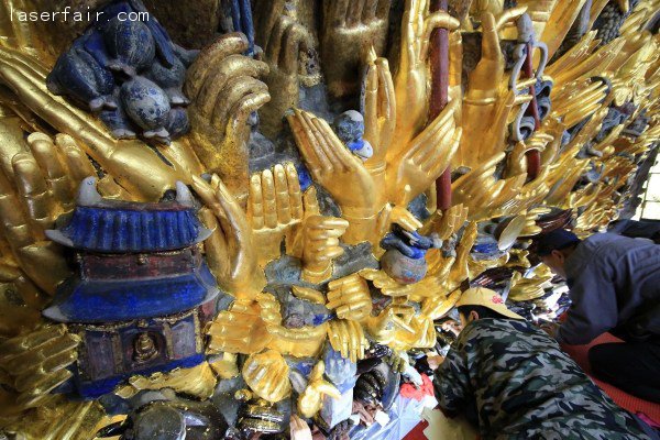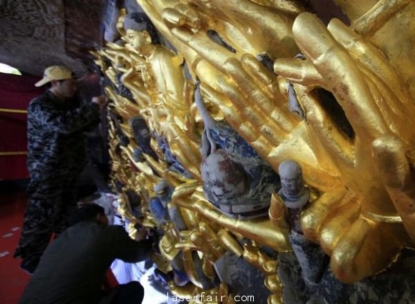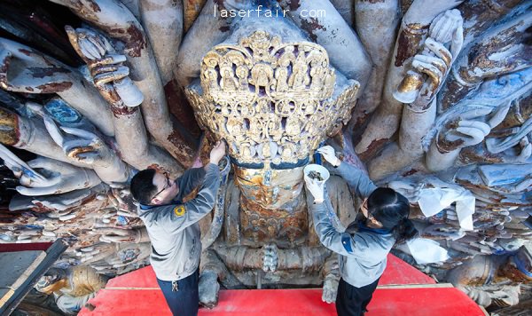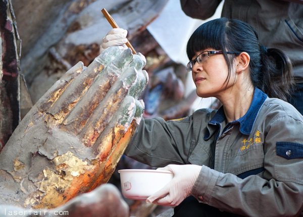 該修複工程開始於(yu) 2011年4月,到現在為(wei) 止的千手觀音的全部830隻手已經恢複。佛像的中間與(yu) 上半部分,共約56平方米的麵積,已清理完畢並重新上漆。