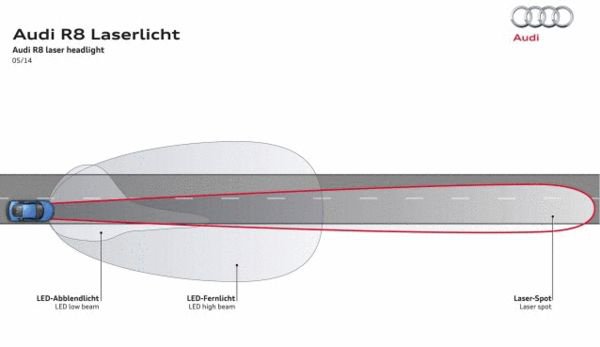 奧迪的這種激光大燈每個(ge) 配有一個(ge) 激光模塊,它生成的光錐距離是奧迪LED大燈的兩(liang) 倍。每個(ge) 模塊由四個(ge) 300微米直徑的激光二極管組成。它們(men) 發出450奈米波長的藍色激光束,然後通過熒光整流器,轉換成色溫為(wei) 5500開爾文的白光。這是最適合夜間照明的白光。奧迪表示,當汽車時速超過60公裏,這種激光燈就會(hui) 打開對基本的LED遠光燈進行補充。此外,一個(ge) 攝像頭會(hui) 被用來偵(zhen) 測車前的行人和汽車,以便調整燈的亮度,防止駕駛員出現盲區。