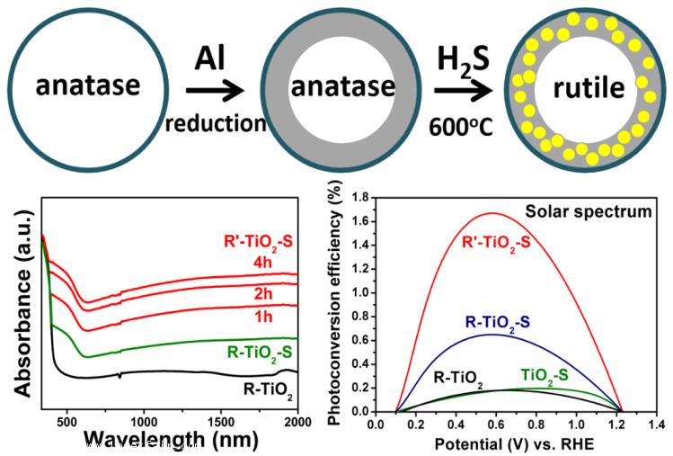 黑色硫摻雜金紅石相二氧化鈦製備示意圖、吸收光譜和光電轉換(JACS 2013)