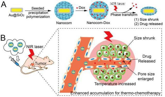 圖 1. 納米複合物Au@SiO2@polymer製備過程(A)與(yu) 腫瘤靶向治療應用圖示(B)