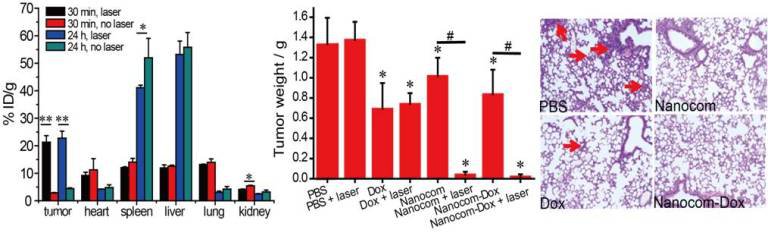 圖2. 納米複合物在激光照射下顯著富集於(yu) 腫瘤組織,其產(chan) 生的熱化療協同效應,有效抑製了腫瘤的生長與(yu) 轉移。