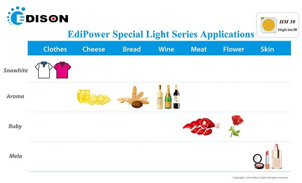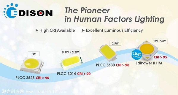 研究指出光源的強度及顏色會(hui) 對人類的心理及生理健康造成影響,LED因具有高演色性及光色可調的特性,可依人體(ti) 需求提供舒適的照明環境,艾笛森 光電以發展人因照明為(wei) 目標,陸續推出多款高CRI產(chan) 品,以PLCC封裝形式為(wei) 例,目前3014(01瓦/0.2瓦)、5630(0.5瓦)及3528(1 瓦)CRI皆已超過90,而以高光效著稱的EdiPower II HM係列更將規格提升至CRI 95以上,不僅(jin) 可應用於(yu) 居家照明及商業(ye) 照明,亦可滿足對光源顯色效果要求極高的博物館及醫院照明。