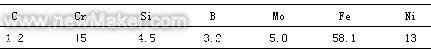 基材選用GH33高溫合金,其化學成分(質量分數,%)為(wei) :C 0.03-0.08、Cr 19.0-22.0、Al 0.60-1.00、Ti 2.40-2.80、餘(yu) 量為(wei) Ni。熔覆材料選擇鐵基合金(如表1)。采用5 kW橫流電激勵CO2激光器,自動送粉。激光熔覆功率為(wei) 3.2 kW,掃描速度為(wei) 450 mm/min,光斑直徑為(wei) 3 mm。
