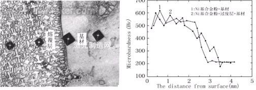 圖6為(wei) 預置塗層及添加稀土元素試樣顯微硬度壓痕的照片。圖7為(wei) 顯微硬度分布曲線。由圖7可見,曲線A為(wei) 沒有Ni基合金中間過渡層的硬度分布,熔覆層與(yu) 基體(ti) 間的硬度發生突變,這樣易在界麵處產(chan) 生裂紋。曲線B為(wei) 有過渡層及少量稀土元素的硬度分布。在交界麵處的硬度值介於(yu) 最外層和基材之間的中間過渡層,使得硬度值分布呈緩慢過渡,而且,純Ni基合金過渡層塑性好,耐衝(chong) 擊性能強,有利於(yu) 預防和減少裂紋的產(chan) 生和擴展。#p#分頁標題#e#