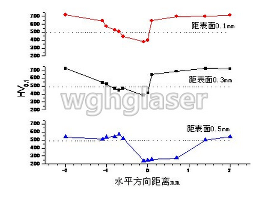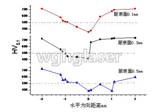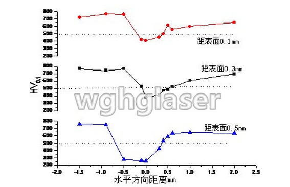 圖2 搭接量為(wei) 1mm、離表麵不同距離處的硬度分布圖