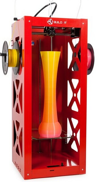 Builder 3D打印機上將會(hui) 安裝一種雙喂料(Dual-Feed)擠出機。注意!這可不是兩(liang) 個(ge) 擠出頭哦,它是用兩(liang) 種材料/顏色通過一個(ge) 噴嘴擠出。這種設置使得它可以使用Builder新的顏色混合工具混合顏色。請看下麵的圖片,這個(ge) 花瓶是是用黃色和粉紅色兩(liang) 種線材打印的,Builder在打印文件中加入了“混色”代碼,於(yu) 是最終生成了一隻漂亮的三色花瓶:粉紅色、橙色和黃色。