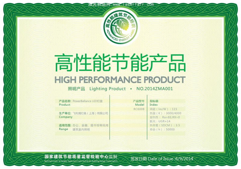 在6月9日由國家建築節能質量監督檢驗中心舉(ju) 辦的“首批高性能建築節能產(chan) 品標識發布會(hui) ”上,飛利浦辦公照明燈具PowerBalance嵌入式LED格柵燈以其卓越的節能性能和高舒適性獲得了照明產(chan) 品類“高性能節能產(chan) 品標識證書(shu) ”。