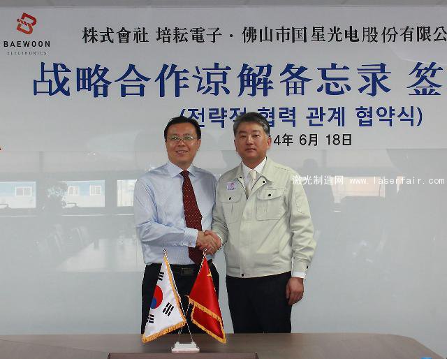 18日,韓國培耘電子公司與(yu) 中國佛山市國星光電股份有限公司簽訂《戰略合作諒解備忘錄》,將在LED照明戰略技術方麵進行合作。圖為(wei) 培耘電子公司代表理事安槿駿(右)與(yu) 佛山市國星光電股份有限公司代表理事王森(左)親(qin) 切握手。