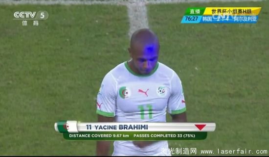 韓國與(yu) 阿爾及利亞(ya) 的比賽進行到第77分鍾,比分4-2領先的阿爾及利亞(ya) 換人,進球功臣布拉西米被拉岑換下。就在布拉西米離場時,他至少三次遭受到了激光筆的照射。首先是布拉西米走向場邊時,這時候可以清楚的看到有幾道藍光在照射他,有的藍光已經照射在了他的臉上。其次便是他到場邊時,這時候幾道藍光還是在閃爍著照射布拉西米。第三次便是在他離開場地後,這時候照射他的變成了綠色激光。