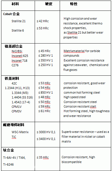 目前,利用激光熔覆技術可以製備鐵基、鎳基、鈷基、鋁基、鈦基、鎂基等金屬基複合材料。從(cong) 功能上分類:可以製備單一或同時兼備多種功能的塗層如:耐磨損、耐腐蝕、耐高溫等以及特殊的功能性塗層。從(cong) 構成塗層的材料體(ti) 係看,從(cong) 二元合金體(ti) 係發展到多元體(ti) 係。多元體(ti) 係的合金成分設計以及多功能性是今後激光熔覆製備新材料的重要發展方向。常見的激光熔覆材料見下表: