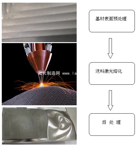 同步送粉式激光熔覆的主要工藝流程為(wei) :基材表麵預處理---送料激光熔化---後處理,如下圖示: