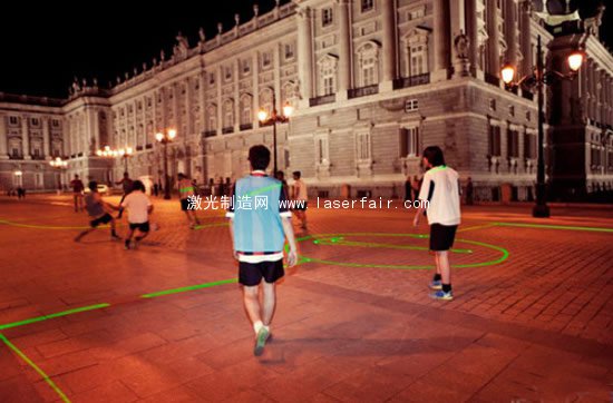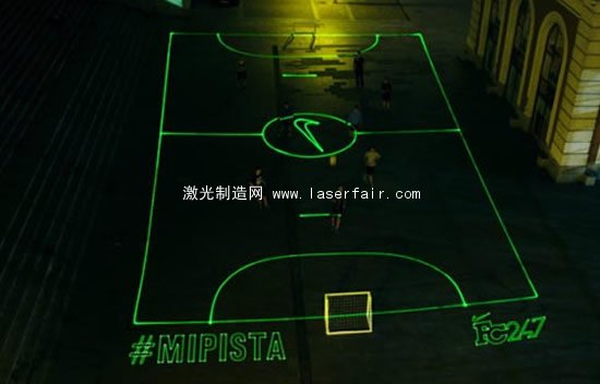 NIKE 為(wei) 了推廣其產(chan) 品,與(yu) 西班牙廣告公司合作,利用一輛載有激光投射機器的貨車,夜裏即可將街頭變成一個(ge) 熒光綠的虛擬足球場。