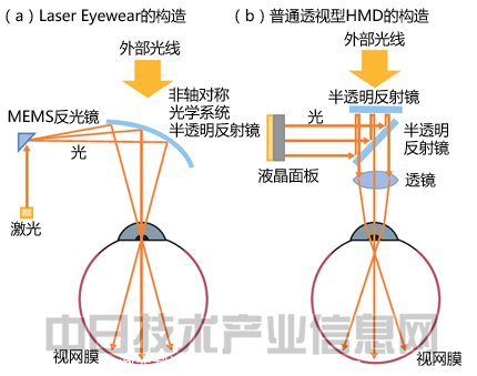 | 圖1 QDLaser公司開發的可使光線高效到達視網膜的“Laser Eyewear”,因為直接向視網膜照射激光,所以具有近視眼等也能高效而清晰地看到影像的優點。而且,光學係統非常簡單。如果是使用液晶麵板的HMD,液晶麵板等會導致入射的光線減弱,因此原理上效率低於Laser Eyewear。另外,光學係統也比較複雜。 |