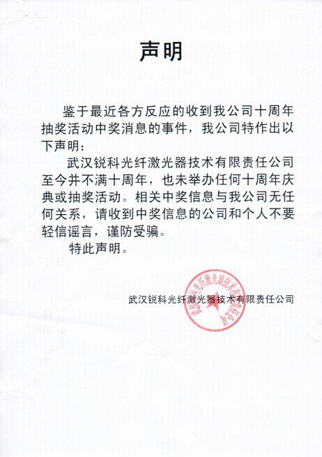 據悉,最近有不法分子傳(chuan) 播銳科公司10周年的抽獎活動信息,企圖欺詐消費者或用戶,經銳科激光公司證實,此消息係虛假,公司成立至今未滿10周年,並未舉(ju) 辦這類活動。該公司也發出了以下聲明,冀消費者與(yu) 用戶不要上當受騙。