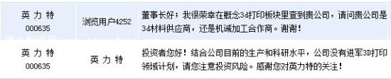 英力特(9.30, 0.10, 1.09%)(000635)周四上午在全景網互動平台向投資者坦言,結合其目前的生產(chan) 和科研水平,公司沒有進軍(jun) 3D打印領域計劃。英力特的主營業(ye) 務為(wei) 聚氯乙烯、燒堿的生產(chan) 與(yu) 銷售。