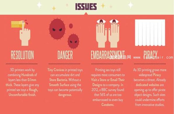 這張信息圖也給了Pink Rocket一個(ge) 機會(hui) ,以一種輕鬆有趣的方式教育他們(men) 的客戶。“我們(men) 喜歡我們(men) 在做的事情,並且堅定地相信性教育是生活中非常重要的一部分,”Gardner表示,“對於(yu) 一個(ge) 普通人來說,購買(mai) 情趣用品總是一件令人感到尷尬的事情,特別是你以前從(cong) 沒買(mai) 過的話。在我們(men) 看來,探索自己的性行為(wei) 並不是一件壞事。”該信息圖在展示3D打印創新性的同時,也揭示了它可能帶來的危險,這包括打印過程導致的表麵粗糙問題,因為(wei) 可能會(hui) 有很多細菌隱藏在縫隙中。