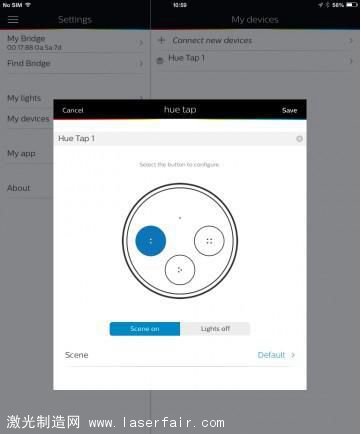 隻要你擁有飛利浦最新版本的Hue應用,就可以方便地設置飛利浦Hue Tap了。按住Hue Tap上的“:”按鍵十秒鍾後鬆開,它就會(hui) 出現在應用程序中,你可以對它進行重新命名及功能設置。