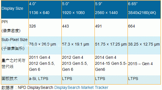 NPD DisplaySearch 觀察到, 目前雖然4K 電視隨處可見, 但以智能手機與(yu) 智能平板等移動裝置麵板而言, 要達到超高分辨率與(yu) 絕對分辨率相比,像素密度(Pixel Per Inch, PPI)為(wei) 麵板製造帶來的困難更多。