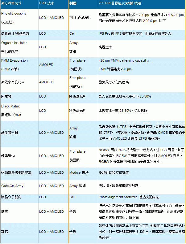 一個(ge) 6吋4K等級的智能手機麵板已經高達734 ppi, 就高達734 ppi的分辨率而言,其關(guan) 鍵的像素設計尺寸已經比先進的半導體(ti) 組件還精細,然而大多數麵板設備和材料的設計原則都相對較為(wei) 寬鬆。因此通常無法應付這種精細度逼近半導體(ti) 極限的製造。另外,FPD麵板由大尺寸、薄玻璃片組成,再通過加工精度權衡FPD麵板尺寸和維持工廠產(chan) 能。因此,牽一發動全身, 要提高分辨率, NPD DisplaySearch 認為(wei) 需要整體(ti) 加強以下表格中各種不同的技術。