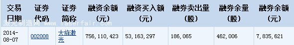 大族激光(002008)2014年8月7日融資融券信息顯示,大族激光融資餘(yu) 額756,110,423元,融資買(mai) 入額53,163,297元,融券賣出量186,065股,融券餘(yu) 量462,006股,融券餘(yu) 額7,835,62...