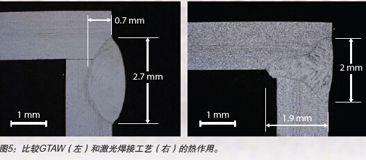 更高的生產(chan) 率。依據不同應用,焊接速度提高了4至8倍。作業(ye) 的精確性, 能精確放置能量點。高重複性。深熔焊接的工件具有小的焦點尺寸和高的功率密度。深熔焊接的焊接熔深比率高。可以焊接具有複雜幾何圖形的接頭以及不同圖案的組件。總的熱作用低(圖5),因而造成的微結構變形非常小,熱影響區也較窄。焊縫的外觀質量高。工件的熱變形最小。焊後操作時間短,成本低。由於(yu) 作業(ye) 距離大,因而具有更高的加工靈活性。
