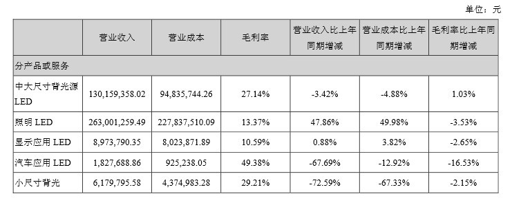 其中,中大尺寸背光源LED實現營業(ye) 收入1.3億(yi) 元,同比下降3.42%,毛利率為(wei) 27.14%,同比增長1.03%;照明LED營業(ye) 收入為(wei) 2.63億(yi) 元,同比增長47.86%,毛利率為(wei) 13.37%,同比下降3.53%;顯示應用LED營業(ye) 收入為(wei) 897.38萬(wan) 元,同比增長0.88%,毛利率為(wei) 10.59%,同比下降2.65%;汽車應用LED營業(ye) 收入為(wei) 182.77萬(wan) 元,同比下降67.69%,毛利率為(wei) 49.38%,同比下降16.53%;小尺寸背光營業(ye) 收入為(wei) 617.98萬(wan) 元,同比下降72.59%,毛利率為(wei) 29.21%,同比下降2.15%。