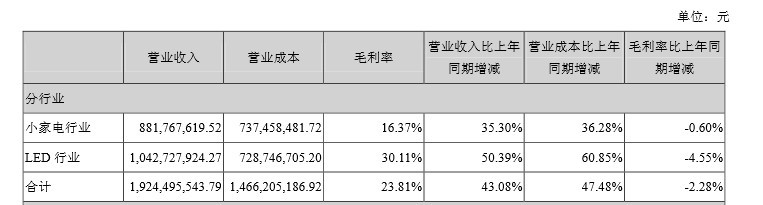 報告期內(nei) ,公司的主營業(ye) 務仍為(wei) 小家電和LED雙主業(ye) 。受益於(yu) LED行業(ye) 良好的增長勢頭以及公司LED產(chan) 能的釋放,上半年,公司LED行業(ye) 實現營業(ye) 收入10.43億(yi) 元,比上年同期增長50.39%。但是,隨著LED行業(ye) 競爭(zheng) 的加劇,LED產(chan) 品銷售價(jia) 格有所下降,以及公司產(chan) 品結構發生變化,導致整體(ti) 毛利率下滑至30.11%,同比下降4.55%。