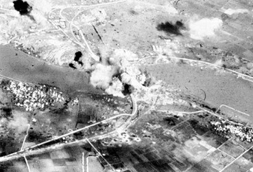 14時,激戰全麵打響,地麵上北越的高射炮猛烈開火,在天空中綻放出無數深褐色煙團,執行掩護任務的美軍(jun) F-100機群則迅速向地麵的高射炮陣地射出火箭彈。與(yu) 此同時,第一個(ge) 攜帶AGM-12導彈的F-105四機編隊在裏斯奈爾中校率領下從(cong) 南麵猛撲清化大橋。正午的陽光照在河麵上,使大橋周圍籠罩上一層霧氣,但裏斯奈爾仍然準確瞄準中央橋墩打出第一枚導彈。當他重新將飛機拉平時,橋梁中部閃出一團火光,導彈擊中目標。之後,攜帶導彈的美軍(jun) 飛機連續向大橋發射導彈……據事後調查,有32枚AGM-12導彈命中大橋,但要麽(me) 因彈著點不夠理想,要麽(me) 因爆炸威力不夠,這些導彈並未能摧毀大橋。