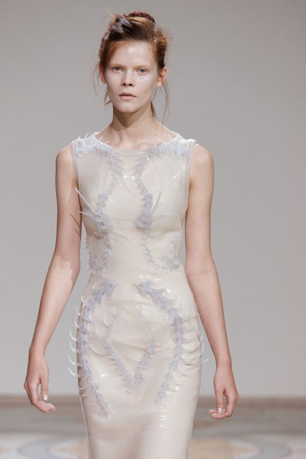 圖二:這條連衣裙是由很多通過3D打印的透明“布片”手工拚接而成。