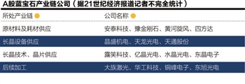 根據21世紀經濟報道記者梳理,幾乎藍寶石全產(chan) 業(ye) 鏈,A股上市公司都有涉及。比如,長晶設備供應商有晶盛機電(300316.SZ)、天龍光電((300029.SZ),原材料及耗材供應商有安泰科技(000969.SZ)、豫金剛石(300064.SZ)、四方達(300179.SZ),長晶技術廠商有露笑科技(002617.SZ)、天通股份、東(dong) 晶電子(002199.SZ)、後續加工方麵有大族激光(002008.SZ)、華工科技(000988.SZ)、億(yi) 晶光電、水晶光電(002273.SZ)等。