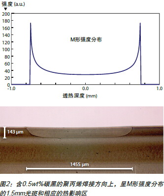 對輪廓焊接和準同步焊接來說, M形光斑強度的分布更為(wei) 方便。顧名思義(yi) ,M形強度分布的圓形平頂光束成像在工件上的光斑在邊緣的強度要高於(yu) 中間位置。這就能確保焊接過程中沿著焊縫方向的溫度分布均勻。圖2顯示了含有0.5wt%碳黑的聚丙烯中的M形強度分布的光斑和相應的熱影響區。這裏的透熱深度是指沿著光束引導方向上的透熱深度。