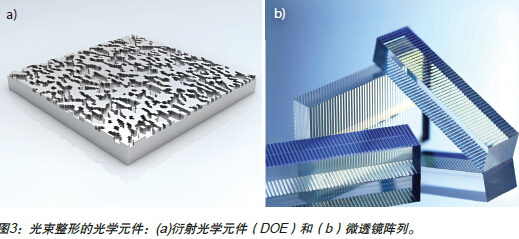 在衍射方法中, 衍射光學元件(DOE)定位在準直激光束的傳(chuan) 播路徑上。衍射光學元件表麵的極小的結構能按照預想的形狀和強度設置來衍射激光光束(圖3)。衍射方法的優(you) 點在於(yu) 可以修改激光光斑的大小和強度。此外,衍射光學元件不需光學對準。因此,可以容易、快速地通過更換衍射光學元件來改變焊縫寬度,而無需更改任何透鏡和工作距離。衍射技術的缺點是相比折射方法具有較高的光損耗,並且根據不同的要求,需要更高亮度的激光源——光纖激光器。