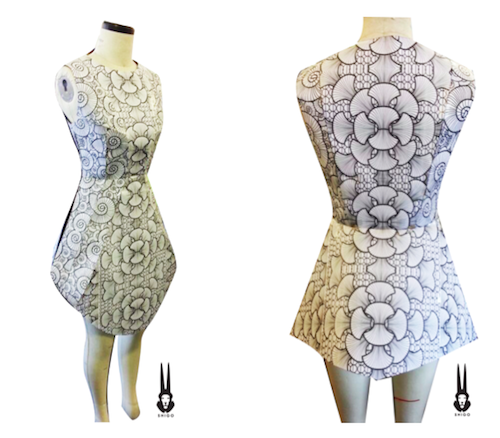 說·篙(SHIGO)這件3D打印連衣裙的設計主題是貝殼。據了解,他們(men) 設計了兩(liang) 種款式的貝殼圖案,在這件蕾絲(si) 連衣裙上反複交織展現。從(cong) 設計、選擇模型,到用3Doodler整個(ge) 工程需時約三個(ge) 月的時間完成,從(cong) 設計,選擇模式,到用3Doodler為(wei) 這件連衣裙加上3D效果,總共花了三個(ge) 月時間。