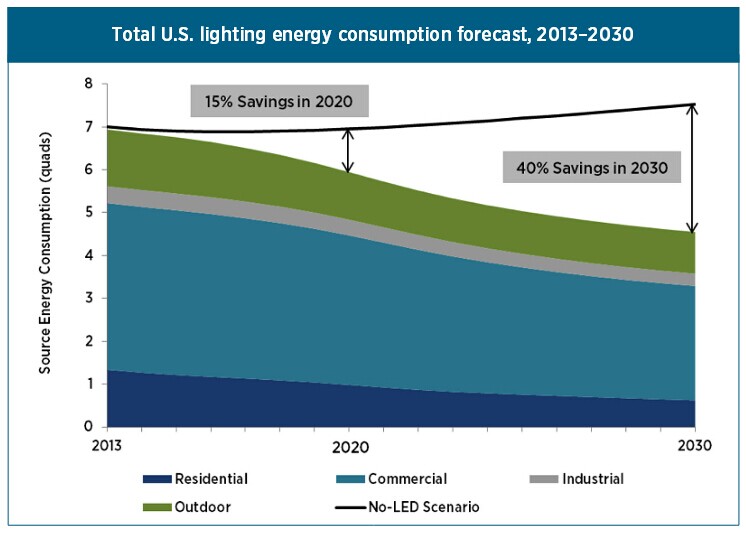 美國能源部(DOE)近日公布了最新版《固態照明在一般照明應用中的節能潛能》。該報告通過與(yu) 傳(chuan) 統白光源相比預測了LED白色光源節能潛力,並比較了美國2013年至2030年每年LED照明滲透與(yu) 否對照明能源消耗的影響。
