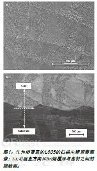 作為(wei) 熔覆層的L605的微觀結構由內(nei) 有細枝晶的柱狀晶粒組成。化學蝕刻顯示柱狀枝晶跨越了多個(ge) 沉積層(圖1a)。不同的灰度表明柱狀晶粒的不同晶體(ti) 取向。通過掃描電鏡觀察可以進一步確認不同取向的晶粒都含有定向凝固的枝晶,並且能繼續生長到鄰近的沉積層。一次枝晶臂間距(PDAS)大約為(wei) 1-2微米;二次枝晶臂間距(SDAS)大約為(wei) 0.5-1.0微米。