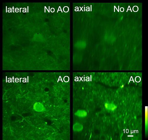 美國Howard Hughes Medical Institute (霍華德·休斯醫學研究所)在Janelia Farm Research Campus的吉娜博士小組與(yu) 來自中科院上海光機所強場激光物理國家重點實驗室的王琛博士最近成功將一種新的自適應光學的方法和雙光子顯微鏡結合,研製出一種新的自適應光學雙光子熒光顯微鏡。通過校正活體(ti) 小鼠大腦的像差,在視覺皮層的不同深度處均獲得了提高數倍的成像分辨率和信號強度,大大改進了成像質量,使得原來在活體(ti) 鼠腦中不可見或者模糊的細節變得清晰可見,她們(men) 成功將該方法應用於(yu) 老鼠視覺皮層第五層(約500µm)的形貌結構成像和鈣離子功能成像。這一新的自適應光學方法,首次使得在活體(ti) 小鼠深層區域成像中獲得近衍射極限的成像分辨率成為(wei) 現實。這一成果以題Multiplexed aberration measurement for deep tissue imaging in vivo發表在最新一期的Nature Methods (自然·方法)雜誌上 (Published online 17 August 2014; doi:10.1038/nmeth.3068),https://www.nature.com/nmeth/journal/vaop/ncurrent/full/nmeth.3068.html