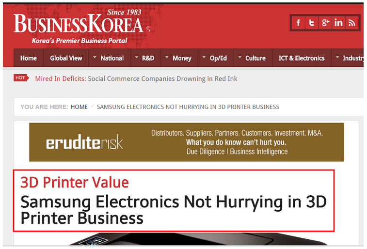 2014年10月7日,韓國領先商務媒體(ti) businesskorea報道稱,三星電子決(jue) 定10年之內(nei) 不啟動3D打印機業(ye) 務。