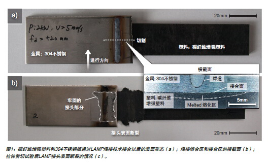 LAMP焊接技術可以牢固地將碳纖維增強塑料片材和304不鏽鋼板焊接在一起,其中使用CW碟片激光器在金屬上生成不焊透焊縫。圖1顯示了聚丙烯腈(PAN)型PA基材碳纖維增強塑料片材與(yu) 304不鏽鋼板之間的激光搭接接頭在做拉伸剪切試驗前、後的情況。其中,碳纖維增強塑料片材厚度為(wei) 3mm、寬度為(wei) 20mm, 具有較長的碳纖維,不鏽鋼板厚度為(wei) 3mm、寬度為(wei) 30mm。橫截麵的照片(見圖1中的插圖)顯示了不鏽鋼中淺層小孔形成的激光焊道。此外,熔化區廣泛分布在碳纖維增強塑料片材中靠近接合麵的區域。在圖1b中,我們(men) 可以觀察到黑色的碳纖維增強塑料片材粘結在304不鏽鋼板的底表麵。特別是,粘結的碳纖維增強塑料部分主要根據激光焊道下的不鏽鋼板而識別出來。在碳纖維增強塑料片材的接合麵中也能看到不鏽鋼的部分。上述事實表明形成牢固的焊接接頭是可行的。
