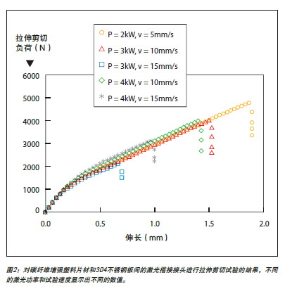 圖2顯示了在不同碟片激光輻照條件下對接頭進行拉伸剪切試驗的結果。結果表明,接頭的最大拉伸剪切負荷(強度)約為(wei) 4800N(20mm寬的碳纖維增強塑料),這一結果是在功率為(wei) 2 kW 和5 mm/s的試驗速度的情況下得出,高於(yu) 碳纖維增強塑料板的拉伸剪切負荷的一半。30mm寬、3mm厚的PA塑料片材與(yu) 304不鏽鋼板之間接頭的拉伸剪切負荷最大約為(wei) 3400N。從(cong) 中我們(men) 可以判斷,20mm寬的碳纖維增強塑料和304 不鏽鋼板之間接頭的最大負荷要遠高於(yu) 30mm寬的PA塑料片材與(yu) 鋼板間的接頭。因此,通過在具有更長碳纖維的聚丙烯腈(PAN)型PA基材碳纖維增強塑料片材和304不鏽鋼板之間形成搭接接頭,可以得到最高的負荷。
