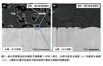 圖3為(wei) 碳纖維增強塑料片材和304不鏽鋼板之間接頭接合麵的掃描電子顯微鏡(SEM)照片。許多亞(ya) 毫米大小的氣泡不規則地分布在碳纖維周圍的塑料基體(ti) 中,這是由激光焊接過程中溶池的高溫引起的熱傳(chuan) 導造成的。據證實,碳纖維增強塑料中氣泡的幾何特征主要取決(jue) 於(yu) 塑料和碳纖維的疊合形狀,以及傳(chuan) 導熱量的水平和碳纖維的長度。據悉,與(yu) 普通塑料相比,碳纖維增強塑料中更容易形成氣泡。對普通塑料來說,氣泡隻形成在界麵附近;而在碳纖維增強塑料中,由於(yu) 纖維表麵與(yu) 基體(ti) 之間的不穩定以及碳纖維具有較高的熱導率,所以氣泡廣泛分布在塑料基體(ti) 中。