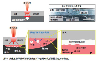進一步地,在7×10-6帕的高壓下,從(cong) 碳纖維增強塑料片材向不鏽鋼板鑽一個(ge) 2mm的孔,並測量鑽孔過程中揮發氣體(ti) 的壓力水平和質譜, 再通過Q-質譜儀(yi) 來分析氣泡中的氣體(ti) 成分。結果表明,氣泡內(nei) 的氣體(ti) 成分為(wei) 氮氣、氫氣和碳纖維增強塑料的PA基體(ti) 裂解產(chan) 生的烴類氣體(ti) 。由於(yu) 裂解後產(chan) 生氣泡並迅速擴張,高壓迫使熔化的塑料進行移動並流入金屬表麵的坡口或晶界。從(cong) 所有試驗中我們(men) 可以推斷出接合機製(見圖5),即,碳纖維增強塑料複合材料與(yu) 不鏽鋼直接接合,是通過化學或物理地粘結熔化的塑料和覆蓋在不鏽鋼上的氧化膜來實現的,此外還要考慮塑料流動到坡口或晶界而引起的機械錨固效應。