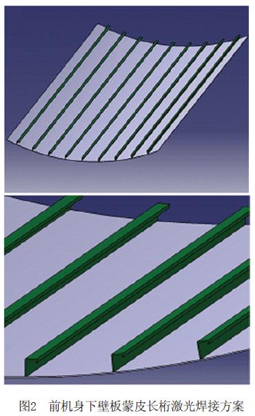 我國大型客機的設計方案中,初步考慮在前機身、中後機身的部分下壁板製造工藝中采用激光焊接工藝。前機身焊接壁板的位置如圖1所示。以該壁板為(wei) 例,單塊壁板尺寸為(wei) 4276mm×1350mm,壁板厚度為(wei) 1.8mm,單塊壁板上桁條多達9根,如圖2所示。因此,屬於(yu) 典型的大尺寸、小厚度、多焊縫的複雜焊接工藝。