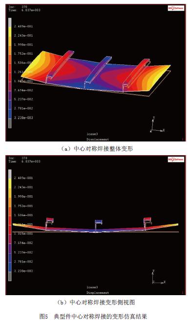 激光焊接機身壁板對比傳(chuan) 統的鉚接機身壁板而言,具有明顯的減重效果,能改善連接部位的性能,同時具有降低製造成本、提高生產(chan) 效率等多方麵的優(you) 點。但是,激光焊接造成的應力集中和變形問題,卻是鉚接過程所不存在的。大型客機機身壁板激光焊接工藝屬於(yu) 大尺寸、小厚度、多焊縫的複雜焊接工藝,其變形過程甚為(wei) 複雜。圖5為(wei) 壁板典型件焊接變形模擬結果,是針對大型客機壁板典型件(3根桁條)開展熱力耦合分析的結果。如圖5所示,即使采用較優(you) 的中心對稱焊接技術(焊接方向相同,順序為(wei) 先中間後兩(liang) 邊),仍然具有較大的變形量。試驗研究也已表明,對於(yu) 多桁條構件,其變形機理複雜。