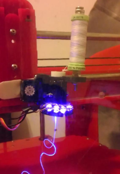 這台原型機是這樣工作的:他在打印機擠出頭那裏裝了一根棉線,然後把棉線的一段泡在UV光敏樹脂裏。浸透了光敏樹脂的棉線不斷從(cong) 打印頭擠出到構件平台上,然後用LED的紫外線燈對其進行照射,使其瞬間固化。