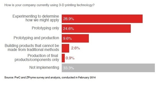 近日,位於(yu) 倫(lun) 敦的英國普華永道國際會(hui) 計事務所(PWC)對一百家製造企業(ye) 進行調查,並作了相關(guan) 的分析報告。調查總結了之前3D打印技術的發展,以及對3D打印技術的發展做了幾個(ge) 方麵的推測。據PWC調查,發現超過三分之二的製造企業(ye) 或多或少地采用了3D打印技術。